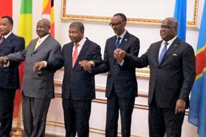 (g à d) Denis Sassou Nguesso, Yoweri Museveni, Lourenço Joao, Paul Kagame et Félix-Antoine Tshisekedi Tshilombo, respectivement présidents du Congo-Brazzaville, d'Ouganda, d'Angola, de Rwanda et de la République démocratique du Congo