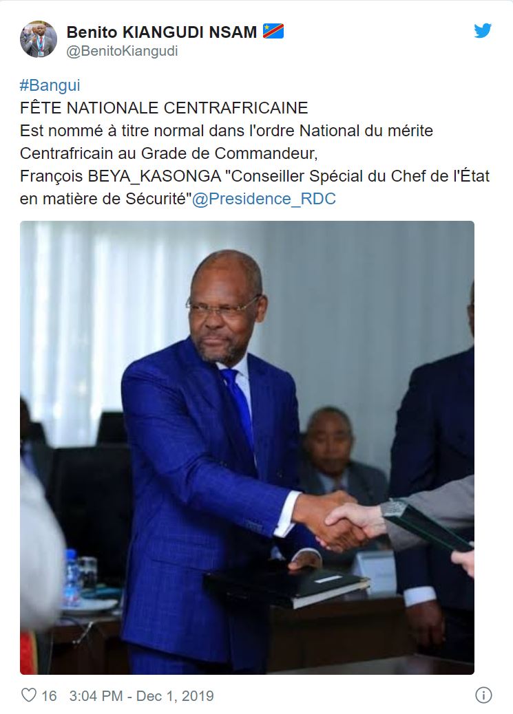 C’est en reconnaissance de ce précieux apports de la RDC que le Conseiller Spécial du Chef de l’État en matière de sécurité Francois Beya a été décoré, comme plusieurs autres personnalités, à l’Ordre National de mérite centrafricain. Il a reçu la cravate de commandeur de l’ordre National de mérite.