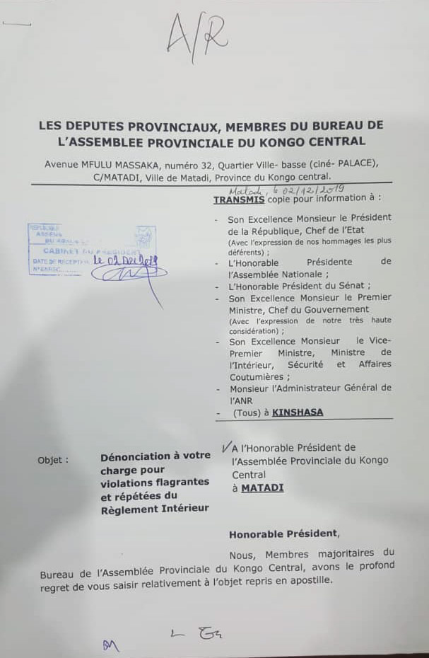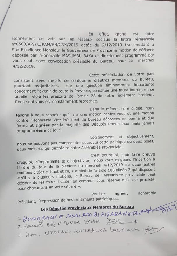 Selon une lettre de protestation parvenue à Ouragan FM, certains membres du Bureau de l’organe délibérant de cette province, dénoncent avec véhémence les irrégularités constatées dans cette motion.