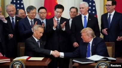 Les États-Unis et la Chine ont signé mercredi 15 janvier 2020 la « Phase 1 » d'un accord commercial censé mettre fin au bras de fer qui oppose les deux premières puissances économiques du monde. L'accord signé marque une trêve dans la douloureuse guerre commerciale entre la Chine et les États-Unis, qui a pesé sur la croissance mondiale.