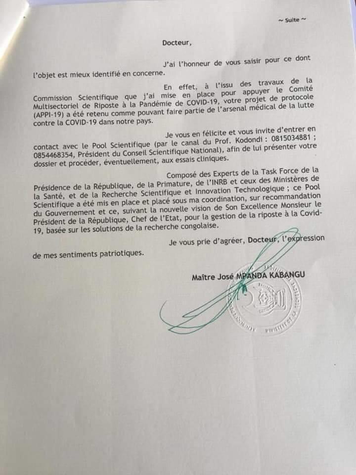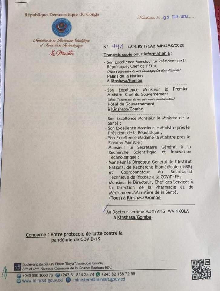 "Votre projet de protocol [APPI-19] a été retenu comme pouvant faire partie de l’arsenal du protocole de la lutte contre la covid-19 en République Démocratique du Congo", peut-on lire dans la correspondance datée du 2 juin du ministre de recherche scientifique, José Mpanda, adressée à Jérôme Munyangi.