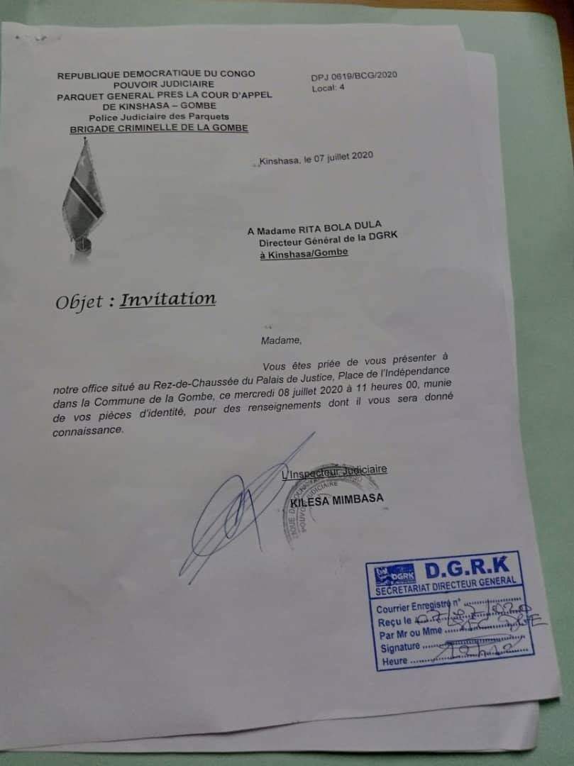 A en croire ce document signé ce mardi 7 juillet 2020 par l'inspecteur judiciaire Kilesa Mimbasa, Rita Bola y est invitée pour des "renseignements" dont il lui sera porté connaissance sur place.