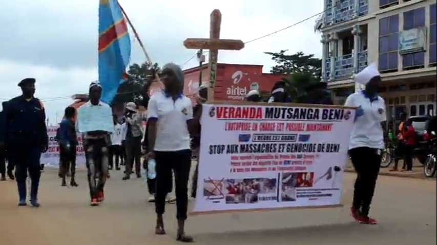 Une partie de la population de Beni est descendue dans la rue le samedi 3 octobre 2020 pour dénoncer la permanence des massacres perpétrés par le groupe armé ADF. Des centaines de personnes, dont les jeunes du groupe de pression «Véranda Mutsanga», portant un cercueil et une croix, comme lors d’une cérémonie funèbre, ont marché pendant plusieurs kilomètres dans les artères principales de la ville jusqu'à la mairie de Beni pour demander à ce que l'autorité de l'Etat soit rétablie dans cette ville.