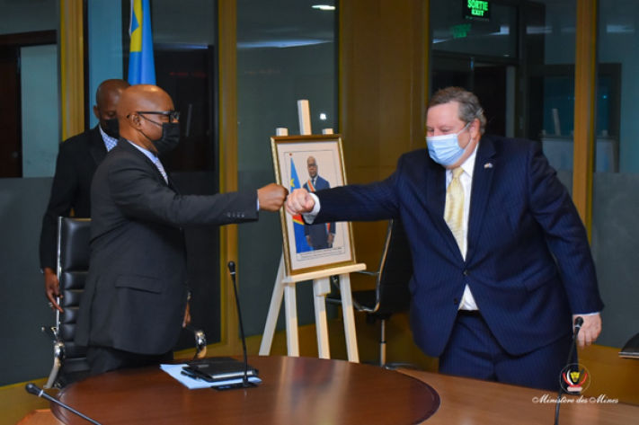 Le vice-ministre des Mines, Godard Motemona a reçu, lundi, au nom de la ministre des Mines, Antoinette N’samba empêchée, l’ambassadeur des Etats-Unis d’Amérique, Mike Hammer venu lui annoncer la mise à la disposition de la RDC d’une aide du gouvernement américain d’un montant estimé à 5.000.000 (cinq millions) USD pour lutter contre le travail des enfants dans les sites miniers et aussi contre l’insécurité autour des sites miniers artisanaux, a appris l’ACP mardi, du ministère des Mines.
