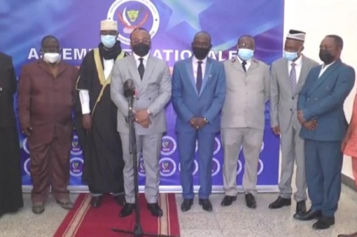 "Au dernier jour du calendrier fixé aux composantes pour le dépôt des procès-verbaux de désignation de membres de la Commission Electorale Nationale Indépendante, CENI, et des pièces y afférentes conformément à l’article 12 de la loi n°10/013 du 20 juillet 2010 portant organisation et fonctionnement de la CENI telle que modifiée et complétée à ce jour, le Président de l’Assemblée nationale, l’Honorable Mbosl N’kodia Pwanga Christophe a reçu dans son Cabinet de travail les Chefs des confessions religieuses chargés de designer le Président de la CENI et un membre à la
