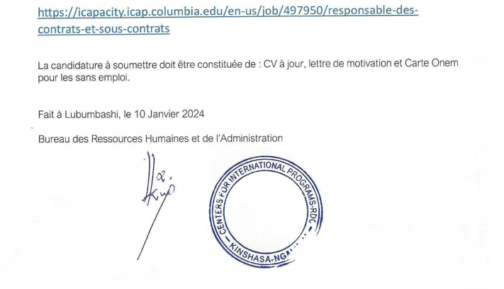 Pour appliquer à ce poste, au plus tard avant la fin de la journée du 26 janvier 2024, les candidats sont priés de cliquer sur le le lien : https://icapacity.icap.columbia.edu/en-us/job/497950/responsable-des-contrats-et-sous-contrats