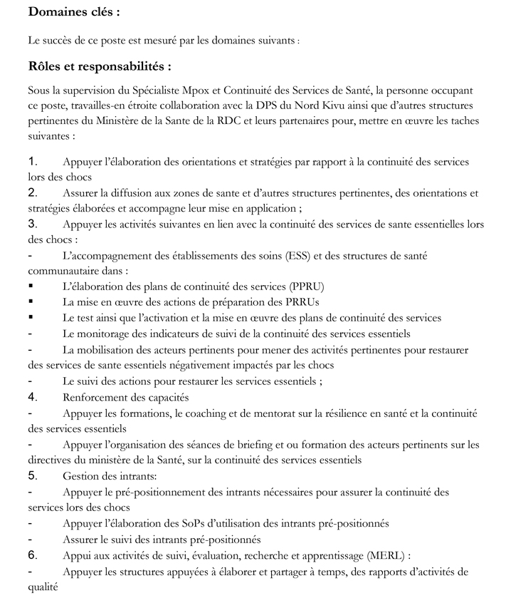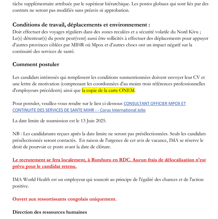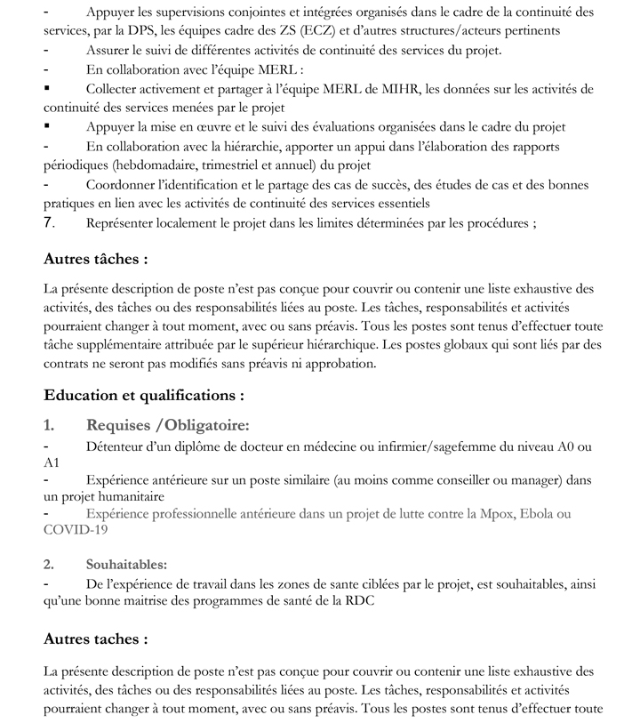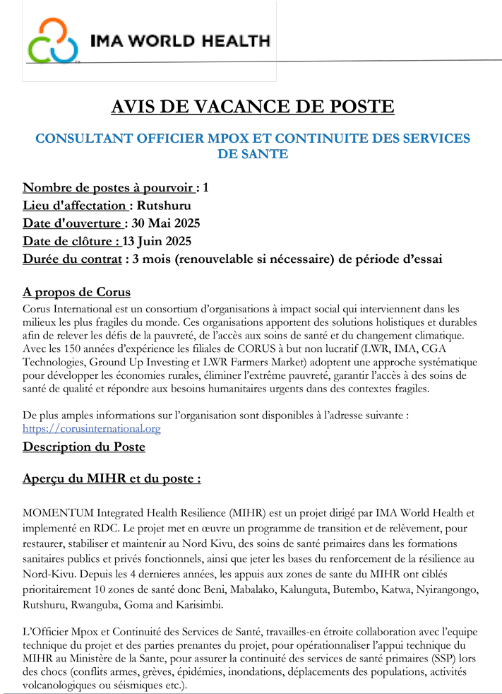 CONSULTANT OFFICIER MPOX ET CONTINUITE DES SERVICES DE SANTE MIHR - - Corus International Jobs