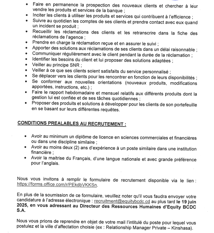 En plus de la soumission de ce formulaire, veuillez noter qu'il vous faudra envoyer votre candidature à l'adresse électronique : recruitment@equitybcdc.cd au plus tard le 19 juin 2025, en vous adressant au Directeur des Ressources Humaines d'Equity BCDC S.A.
