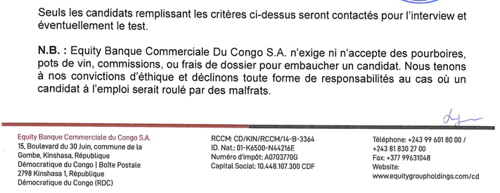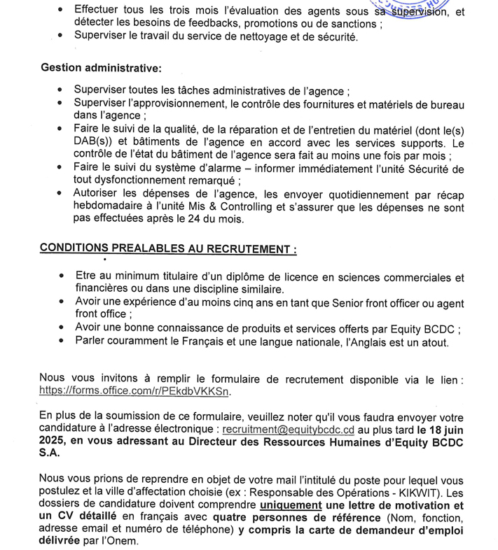 En plus de la soumission de ce formulaire, veuillez noter qu'il vous faudra envoyer votre candidature à l'adresse électronique : recruitment@equitybcdc.cd au plus tard le 18 juin 2025, en vous adressant au Directeur des Ressources Humaines d'Equity BCDC S.A.
