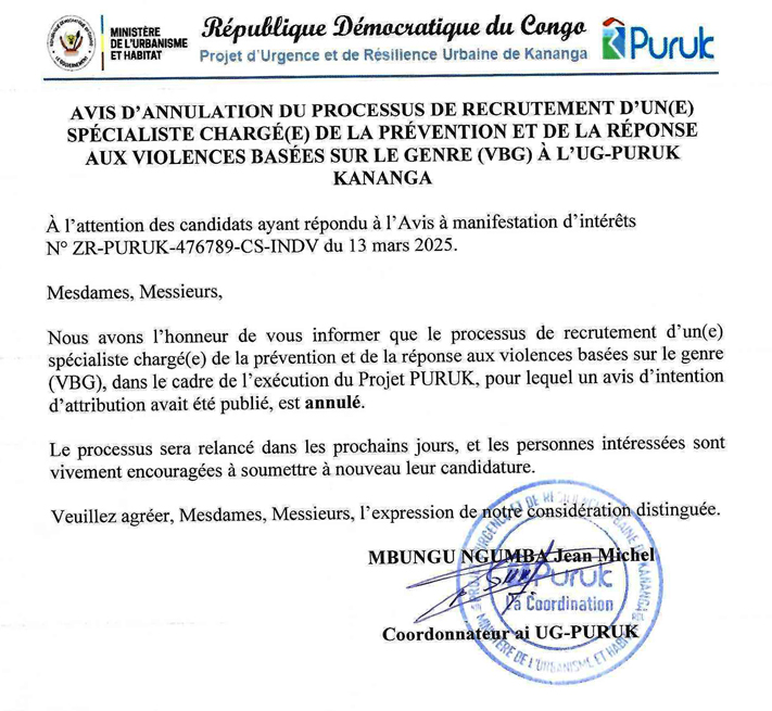 Avis d'annulation du processus de recrutement d'un(e) Spécialiste chargé(e) de la prévention et de la réponse aux violences basées sur le Genre (VBG) à l'UG-PURUK Kananga