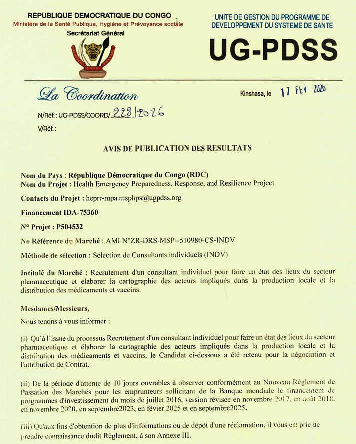 Attribution de Marché Consultant individuel pour faire les états de lieux du secteur pharmaceutique et élaborer la cartographie des acteurs impliqués dans la production locale et la distribution des médicaments et vaccins