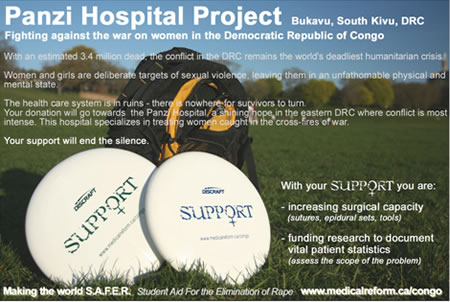 Pendant que les fils de sutures envoyés par S.A.F.E.R. ont été acheminés vers le Congo, une autre campagne contre la violence des femmes au Congo grandit rapidement. Une nouvelle initiative pour la levée de fonds avait commencé à Toronto: C'est la vente des disques de frisbee. Cent disques ont été déjà vendus, et en même temps, un autre lot de cent était commandé par des gens en Allemande. L'explosion du soutien pour la campagne en allemande était une grande surprise. Maintenant quelques gens en Italie ont exprimé leur intérêt aussi. Le succès européen du soutien accordé à la campagne indique que la cause que nous défendons devient une affaire globale.